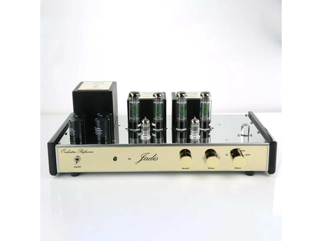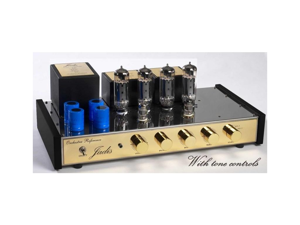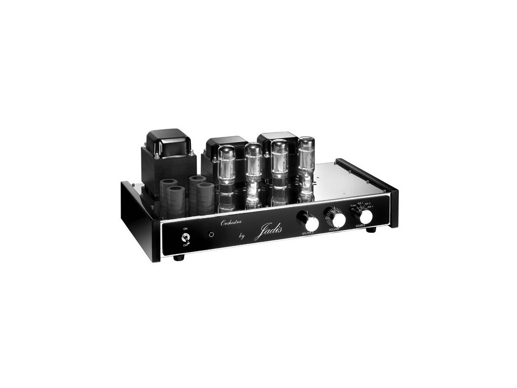 Integrovaný zesilovač s volitelným dálkovým ovládáním. Jadis Orchestra je postaven na šasi z nerezavějící oceli s elektronkami osazenými na keramických objímkách se zlatými konektory.
